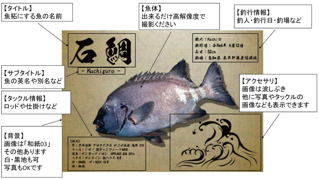 アクセサリ:※記念写真やタックルの画像・波しぶきなどの画像も入れられます